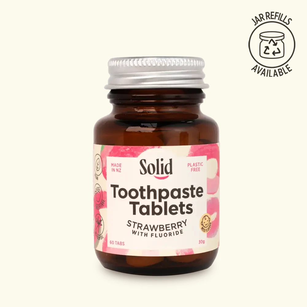 Plastic free, NZ made strawberry toothpaste tablets in a glass jar